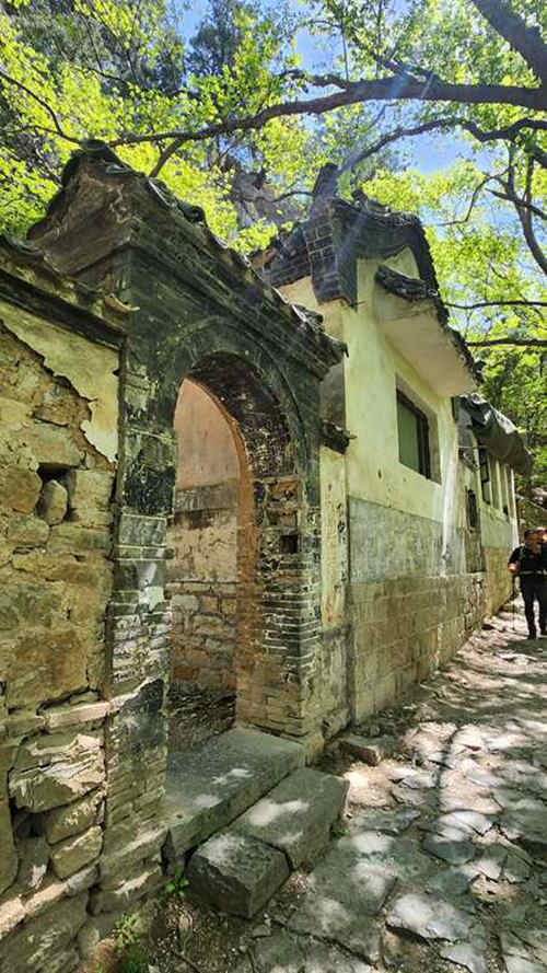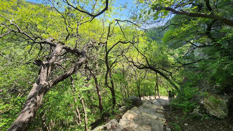 行至乱石岗,攀援而上,即见巨石嶙峋,登临高处,苍穹之势,豁然在目。远望群山如黛,近窥涧溪萦回,满目青绿瞬间铺展成一幅天然水墨长卷。此时,山风入怀,胸次顿开。往日案牍劳形、尘间俗务缠累,尽被长风吹散。佛峪之春,醒而不躁,盛而不喧,恰如天地初开的清和,无半分刻意雕琢。越岗而至峪顶桃林,晚春桃花虽过盛期,仍有残红轻摇,风过处落英如雪,暗香浮动。念及李煜“林花谢了春红,太匆匆”,昨日春雨虽急,却也让这暮春花事更添一段可叹可感的余韵。再行经佛峪平坡,入苍郁柏林,东行山势渐缓,心境亦随之沉宁。